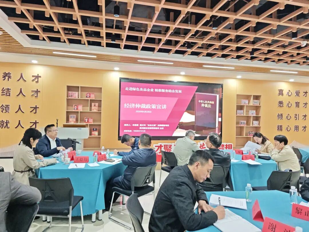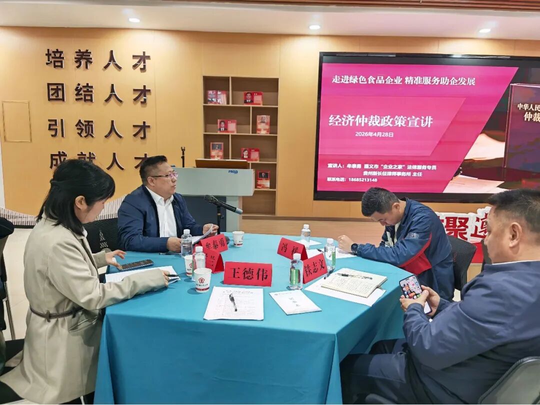 4月28日,由遵义市工商联、民建遵义市委联合主办的遵义市“企业之家”商会轮值暨民建遵义市委“星五·政企沙龙”在遵义市人才服务中心举行。本次沙龙以“走进绿色食品企业 精准服务助企发展”为主题,来自市工商联、市政务服务管理局有关负责人及老谢氏食品、最黔线食品、金紫阳食品等企业代表参加。我所主任、创始合伙人、遵义市“企业之家”法律服务专员牟泰勇律师为大家开展经济仲裁政策宣讲。