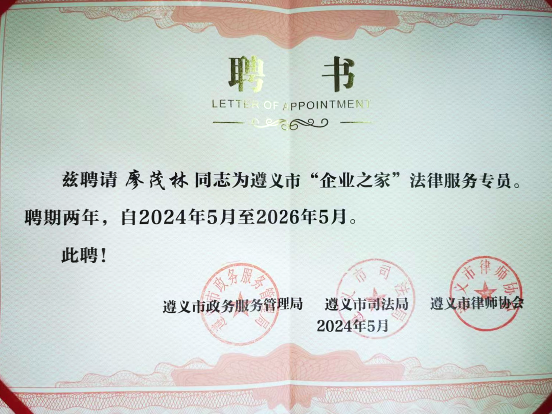 我所主任牟泰勇、副主任廖茂林受聘为遵义市“企业之家”法律服务专员