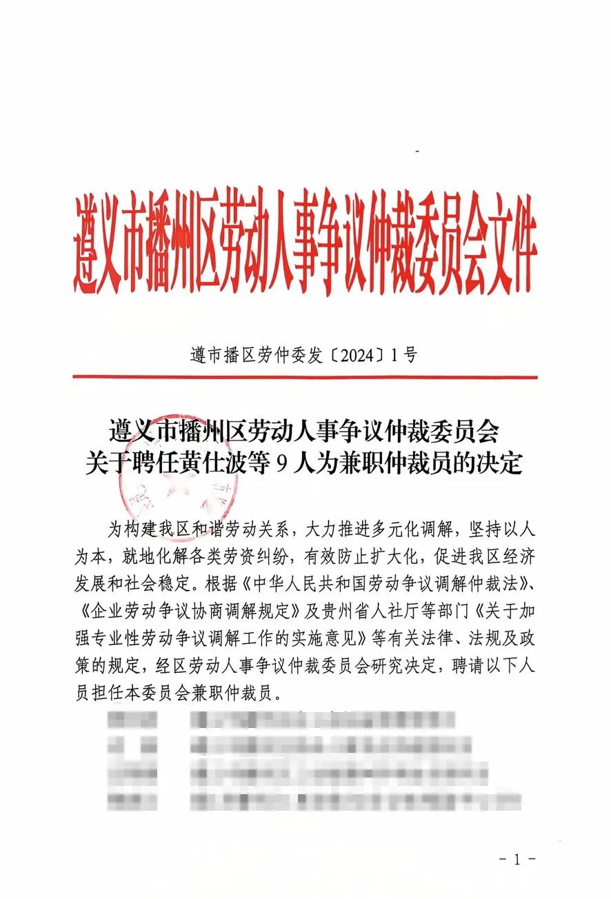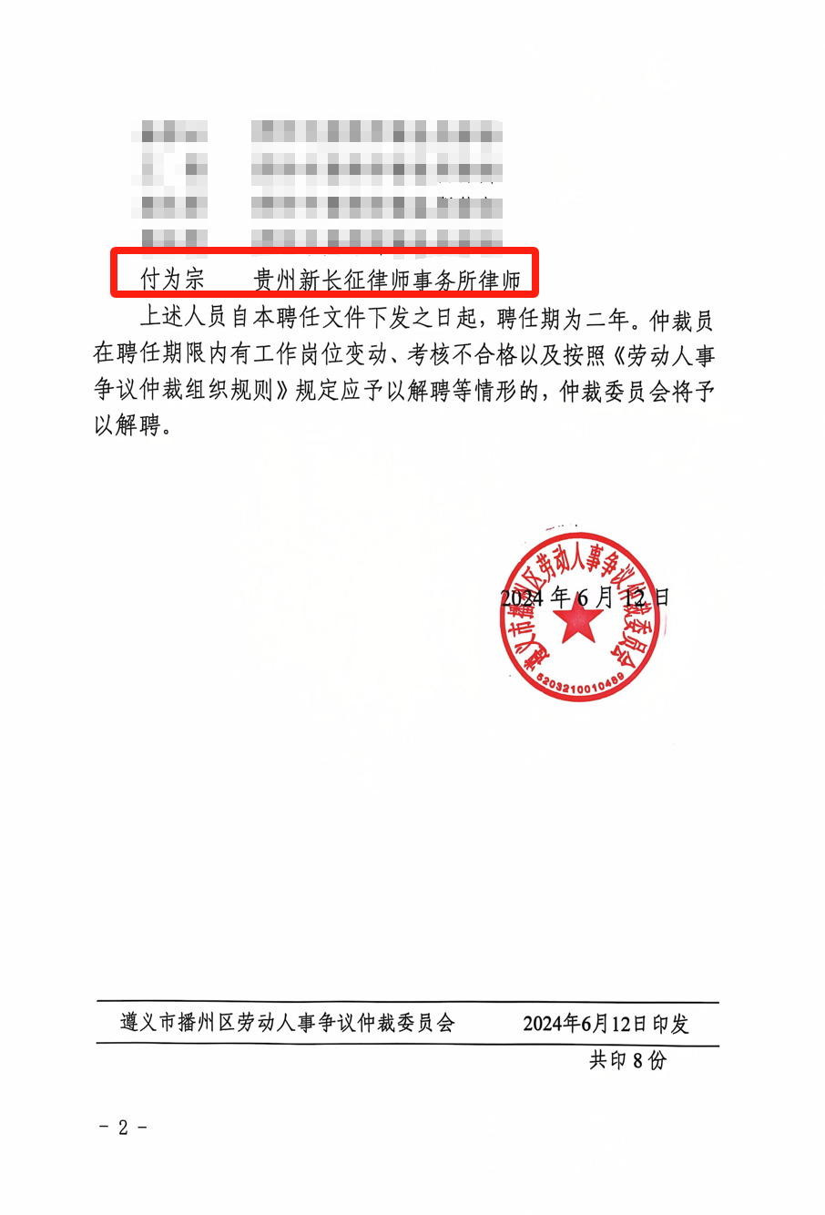 新长征喜讯 | 我所初级合伙人付为宗律师受聘为遵义市播州区劳动人事争议仲裁委员会兼职仲裁员