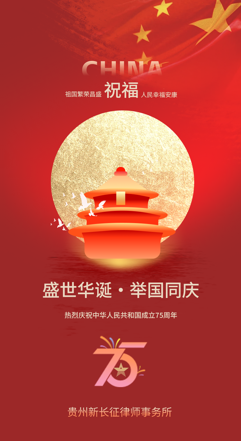 在这举国欢庆之际,我们迎来了中华人民共和国成立75周年的喜庆时刻。贵州新长征律师事务所全体成员向您致以最诚挚的节日祝福!感谢大家长期以来对我们工作的支持与信任。